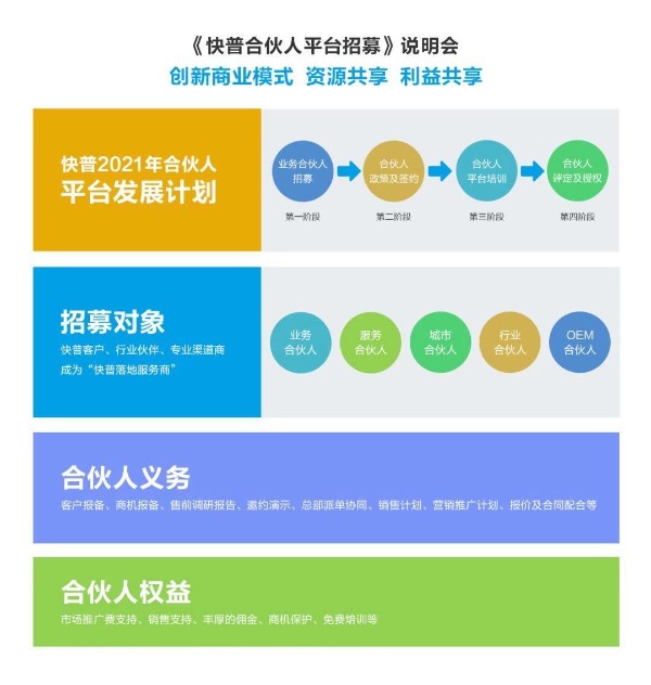 快普合伙人平臺(tái)將依托快普整合管理、專注細(xì)分行業(yè)與強(qiáng)大的技術(shù)平臺(tái)支持三大優(yōu)勢,面向各行各業(yè)招募合伙人,通過多種合作形式,建立“快普落地服務(wù)商”,幫助全國更多企業(yè)實(shí)現(xiàn)信息化轉(zhuǎn)型,提高企業(yè)的技術(shù)創(chuàng)新能力與品牌價(jià)值。