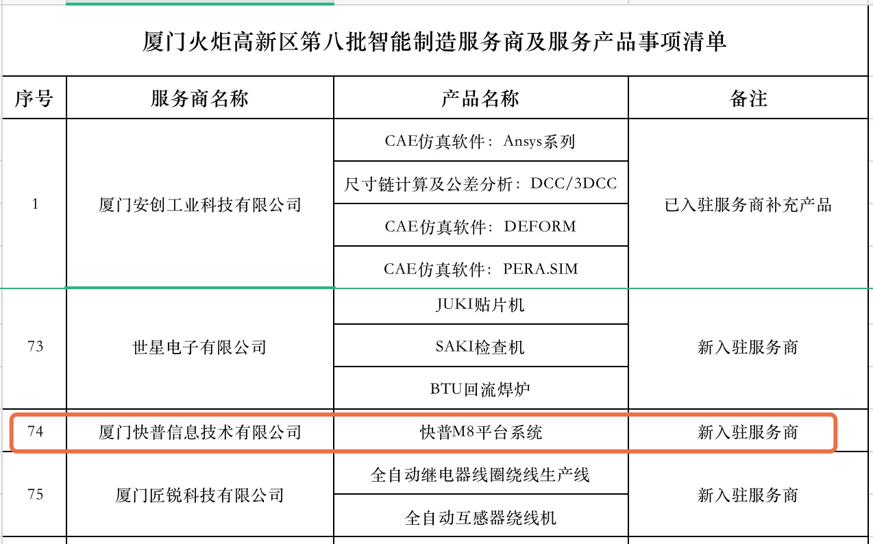 近日,廈門火炬高新區(qū)管委會公布第八批“火炬智能制造服務(wù)商”和“智能制造產(chǎn)品服務(wù)”,經(jīng)服務(wù)機(jī)構(gòu)申報、運營單位初審、業(yè)務(wù)處室復(fù)審、專家組評審等環(huán)節(jié),廈門快普信息技術(shù)有限公司及自主研發(fā)產(chǎn)品“快普M8平臺系統(tǒng)”正式入選。