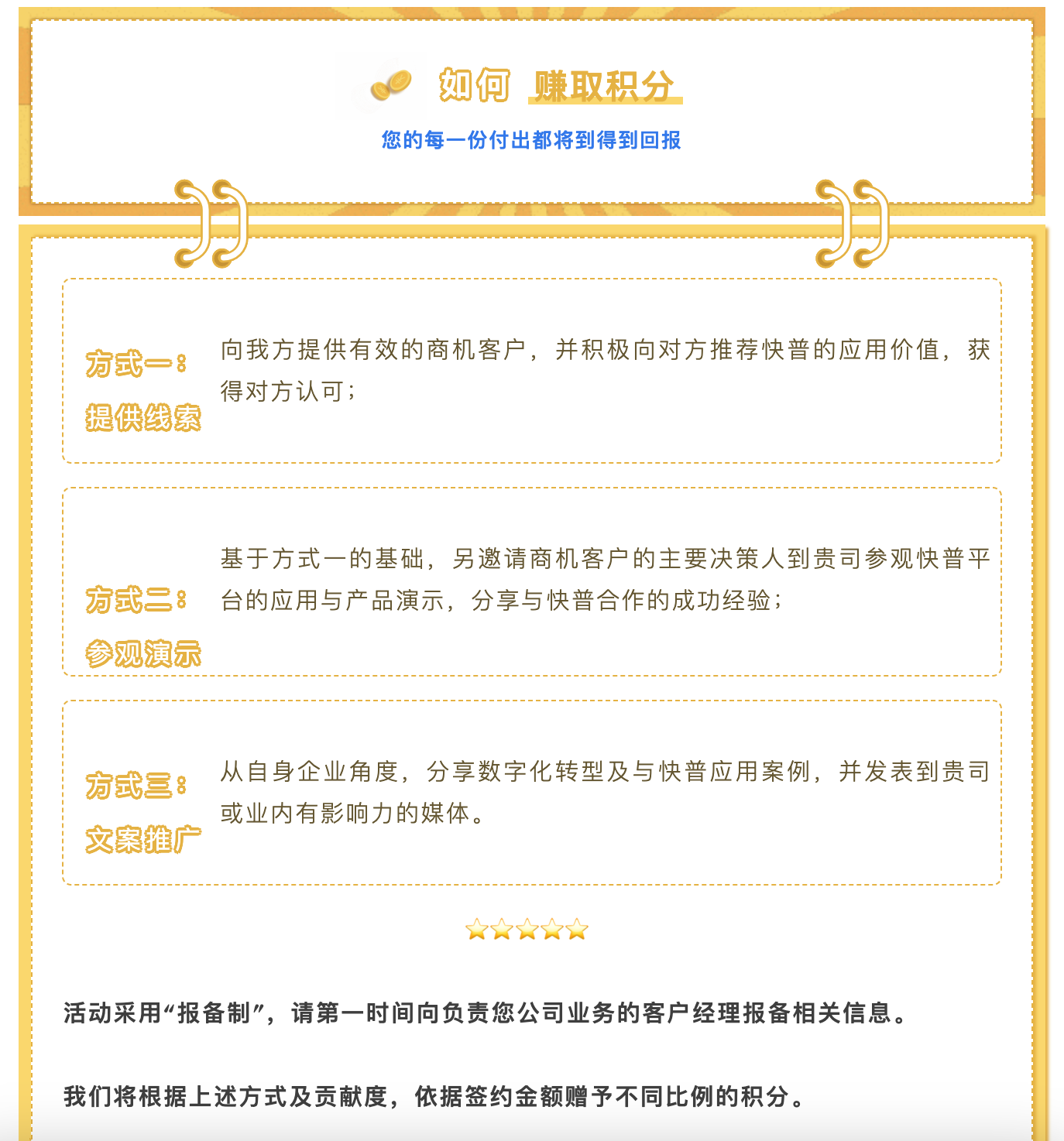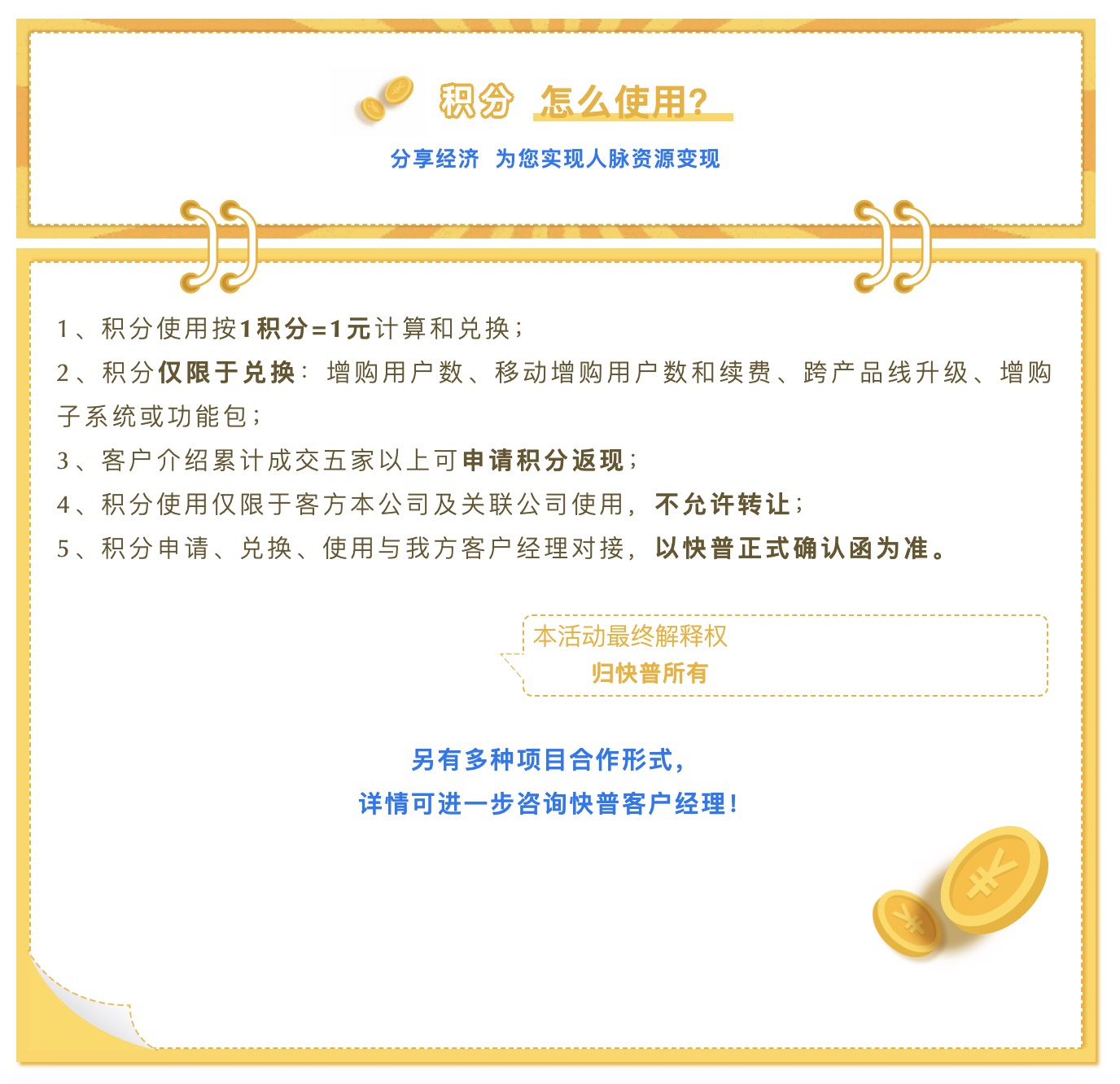 為進(jìn)一步回饋老用戶的貢獻(xiàn),現(xiàn)誠(chéng)邀您參與“快普感恩回饋大行動(dòng)!”,與我們共享數(shù)字經(jīng)濟(jì)發(fā)展的紅利!通過(guò)主動(dòng)推薦、轉(zhuǎn)介紹客戶,您將獲取豐厚的積分返利,讓您的每一份付出都得到實(shí)質(zhì)性的回報(bào),人脈資源也可以獲得變現(xiàn)!