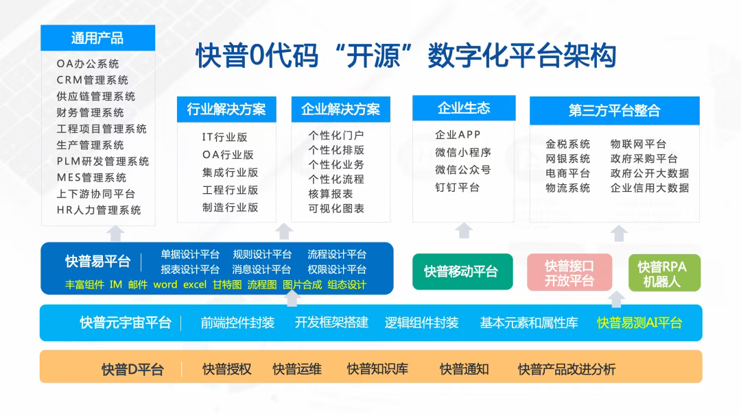為此,快普依托自主研發(fā)的“快普易”整合管理平臺,以先進(jìn)的技術(shù)架構(gòu)為企業(yè)提供簡單、靈活的應(yīng)用體驗。平臺具備零代碼配置、多系統(tǒng)無縫整合、AI深度嵌入等核心優(yōu)勢,為企業(yè)提供一條“小快輕準(zhǔn)”的數(shù)字化轉(zhuǎn)型路徑: